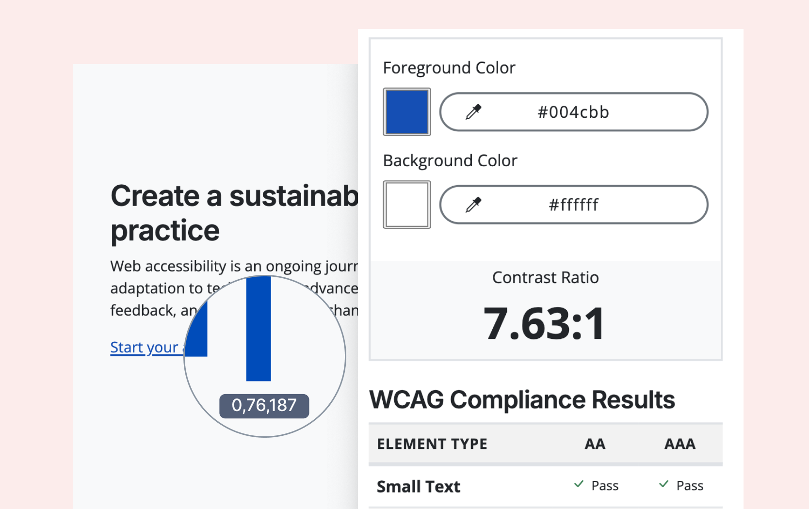 Test any color combinations to see if they meet WCAG contrast requirements, ideal for agencies and designers ensuring accessible color choices.