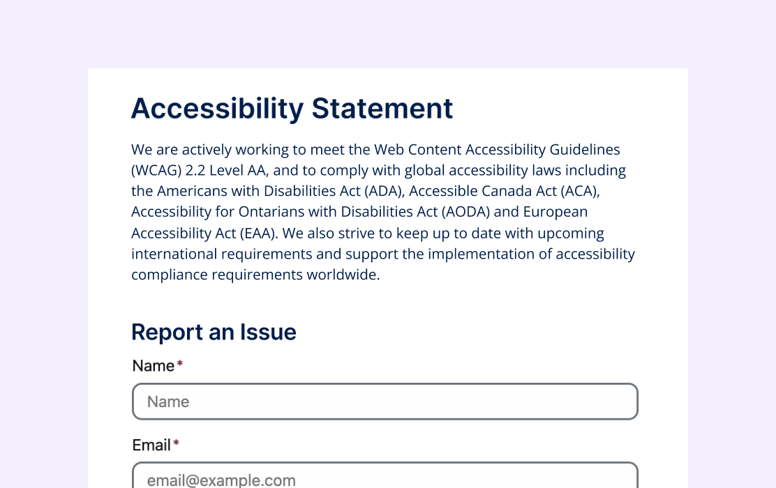 Create a clear accessibility statement in minutes, or use RAMP to simplify everything with our AI statement generator and user feedback form that routes user submissions into your workflow.